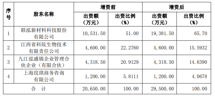 12月6日,聯(lián)泓新科發(fā)布公告稱,為加快公司戰(zhàn)略布局及發(fā)展,補充江西科院生物新材料有限公司流動資金,改善其資產(chǎn)負債結(jié)構(gòu),公司擬以自有資金向科院生物增資1.5億元,科院生物其他股東不同步參與本次增資。其中,8850萬元計入注冊資本,剩余6150萬元計入資本公積。