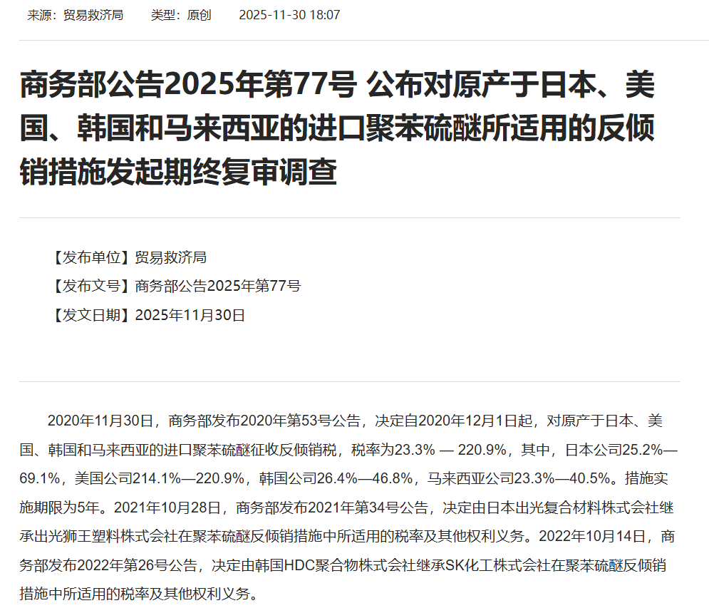 商務部宣布自2025年12月1日起,對原產于日本、美國、韓國和馬來西亞的進口聚苯硫醚(PPS)所適用的反傾銷措施進行期終復審調查。在為期一年的復審期間,將繼續(xù)實施反傾銷措施。