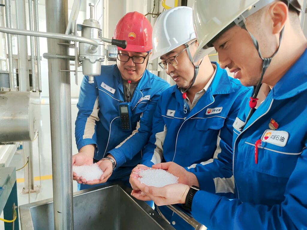 ▲ 圖為20萬(wàn)噸聚丙烯工程師正在采樣觀(guān)看聚丙烯粒料成色以及圓潤(rùn)度
