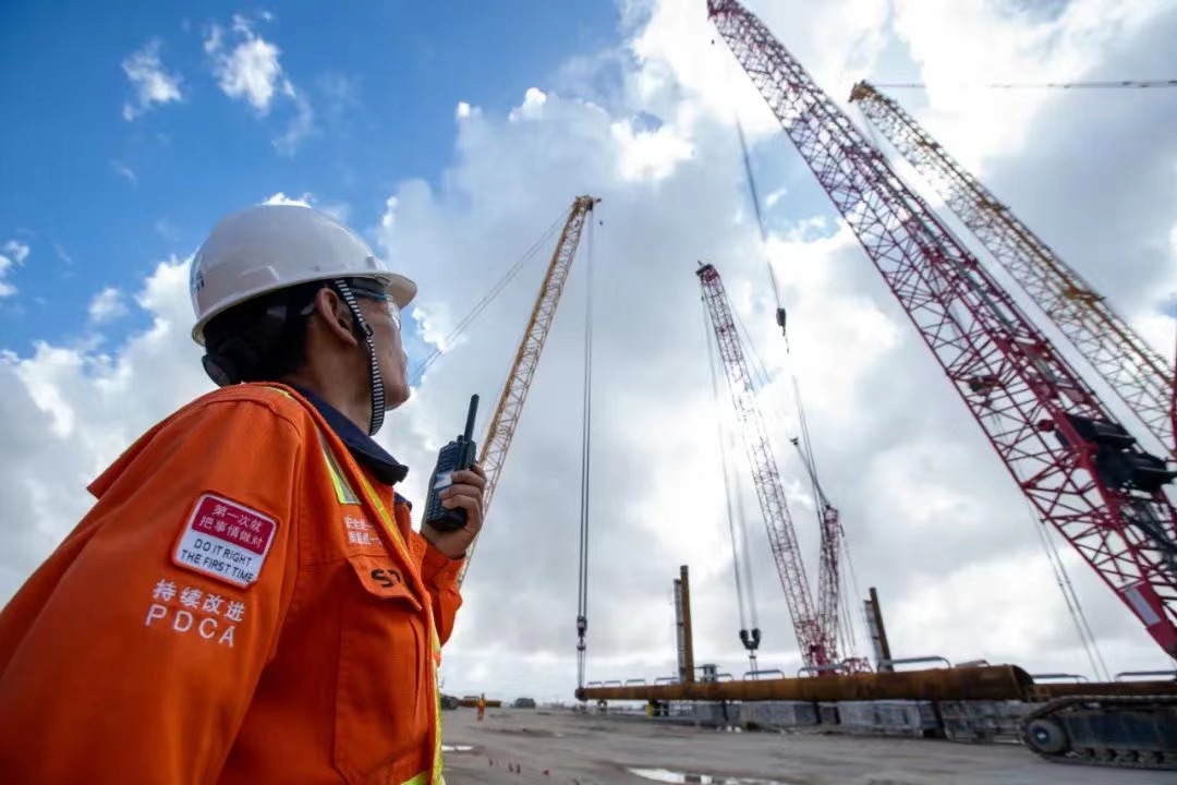 ▲亞洲第一深水導(dǎo)管架“?;?hào)”主體結(jié)構(gòu)完工。劉聰/攝