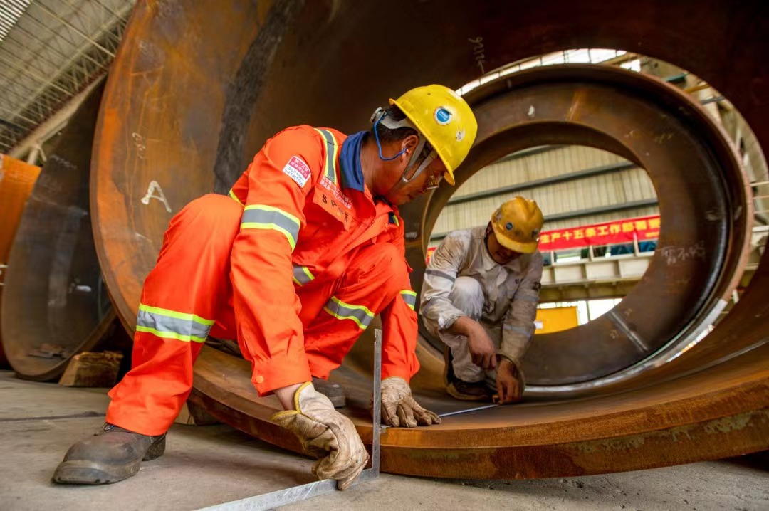 ▲項(xiàng)目人員仔細(xì)復(fù)核導(dǎo)管架結(jié)構(gòu)物尺寸,確保組裝精確度達(dá)到設(shè)計(jì)標(biāo)準(zhǔn)。劉聰/攝